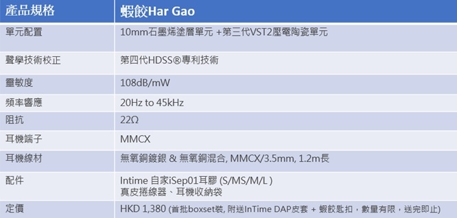 蝦餃三頻平衡,聲底厚潤順滑,有寬闊音場及動態,有如一味咬落新鮮蝦餃,爽口香滑,有溫暖的感覺!蝦餃同其他InTime型號一樣係日本製造!首批限量版更以boxset發售,附送InTime DAP皮套 & 蝦餃匙扣!