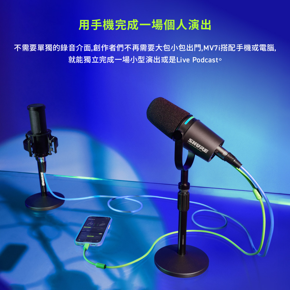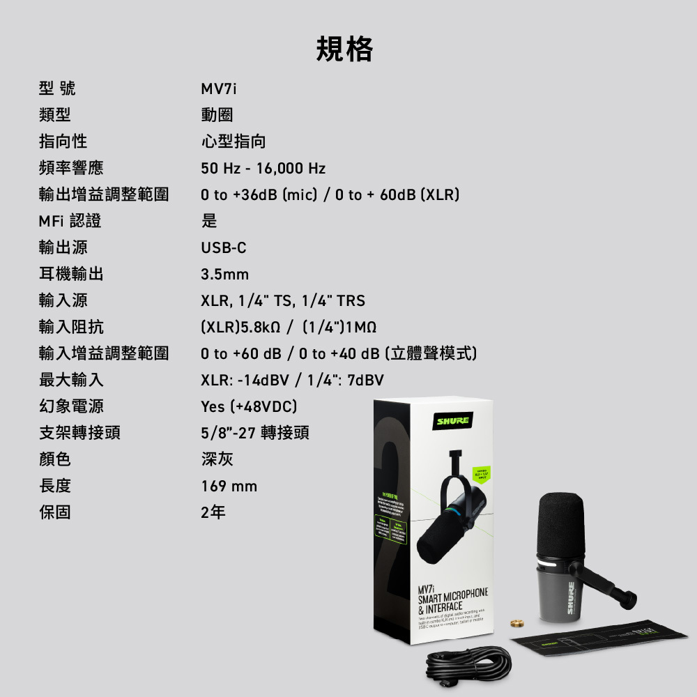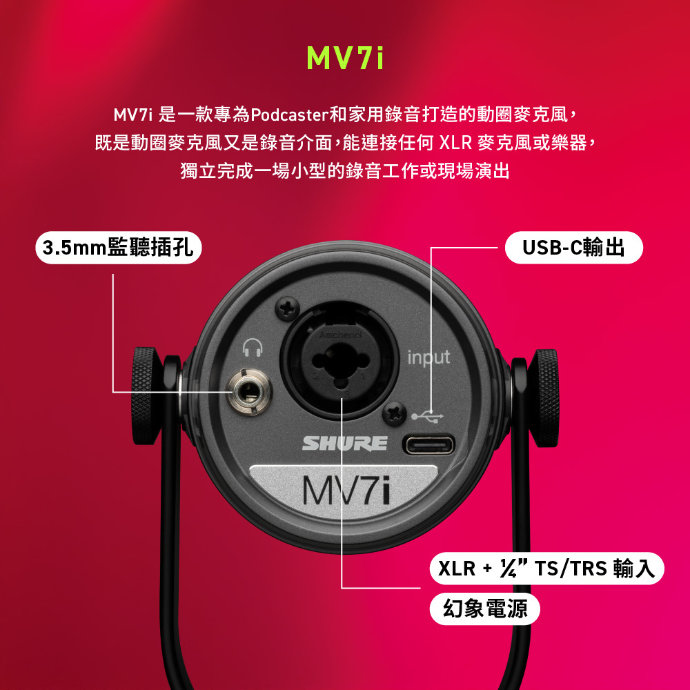 利用Shure MV7i智慧麥克風和音訊接口,邁入錄音新時代。這款首創的整合式音訊介面的USB麥克風,簡化了在電腦、平板和智慧型手機上的雙通道錄音設定。透過複合 XLR 和 ¼” 輸入連接任何 XLR 麥克風或樂器,您將不再需要訊號路徑中的外部音訊介面。使用 MOTIV 應用程式輕鬆管理錄音。透過先進的 DSP 功能享受廣播級音質。光滑的全金屬設計和可調節的支架,使其成為追求簡潔性和專業級性能的創作者的理想選擇。