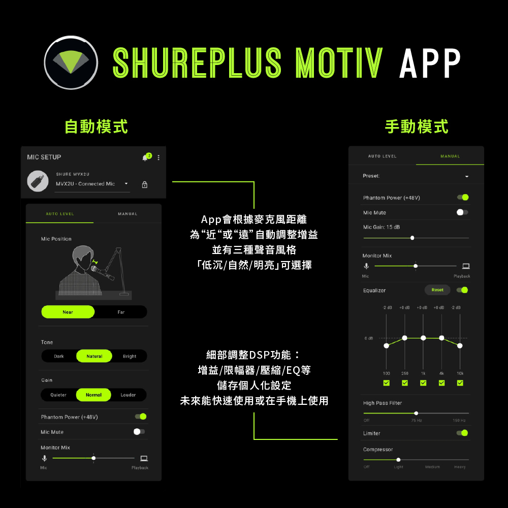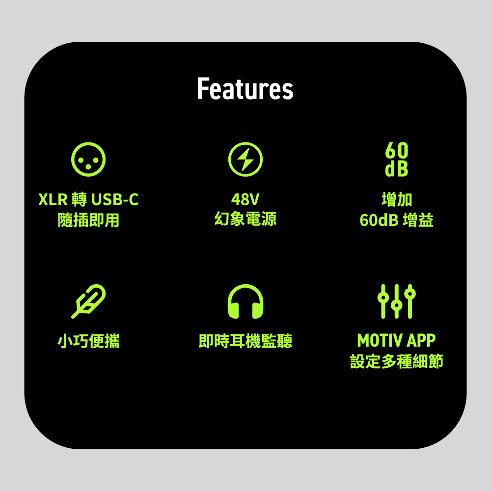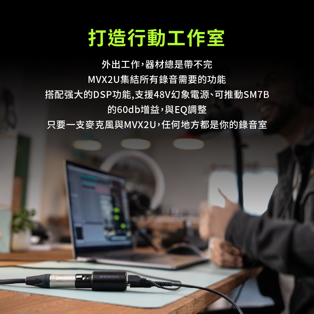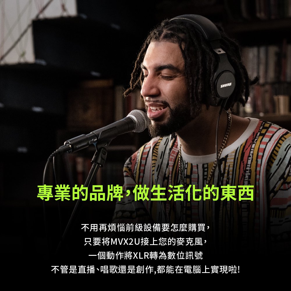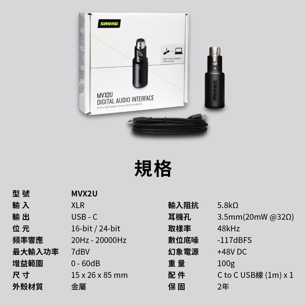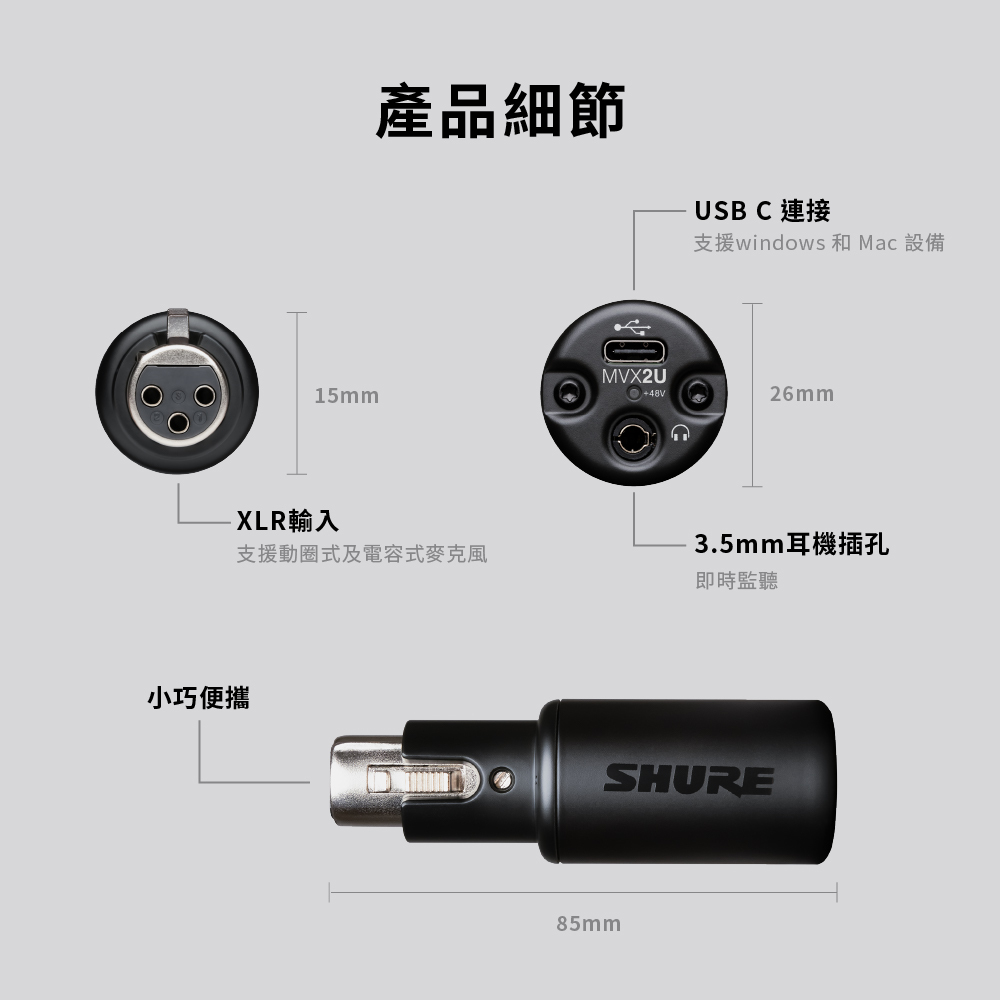 使用MVX2U音訊接口,可以輕鬆地將XLR麥克風直接連接到電腦。 這款緊湊型XLR至USB設備可與動圈麥克風或電容麥克風協作進行錄音或直播,開箱即用,非常適合主播、播客、創作者和音樂人使用,透過免費的 ShurePlus MOTIV桌面應用程序,使用板載DSP升級音質。